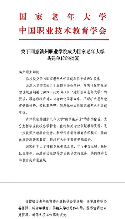 共建单位获批后,国家老年大学将在课程资源汇聚、学习平台互联、教师队伍培养等方面提供支持服务,滨州老年开放大学将以此为契机,坚持国家老年大学“德学康乐为”的办学宗旨,充分发挥职业院校办学特色与产教融合优势,积极探索老年教育办学新模式,推动优质教学资源普惠共享,共同推进老年教育高质量发展。